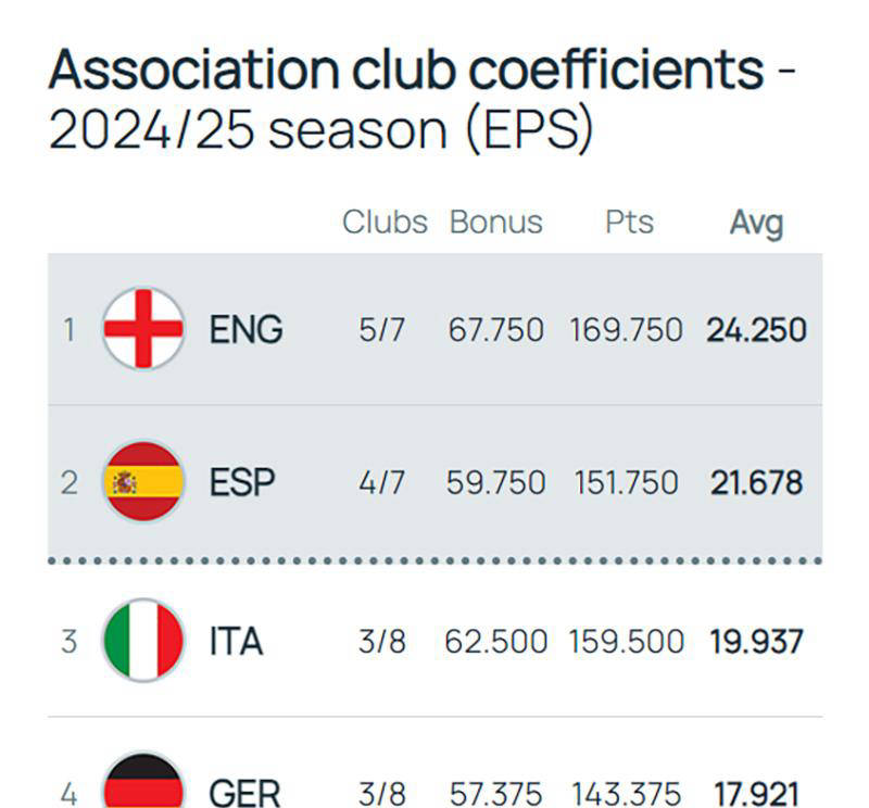 根据欧足联积分榜来看,英超已经基本确定了本赛季的前两名,而西甲领先意甲的优势也非常明显,这意味着这两个联赛的第五名将有资格参加下赛季的欧冠。相较于上个赛季获得5个欧冠资格的意甲和德甲,它们现在被限定在传统的四个名额当中。